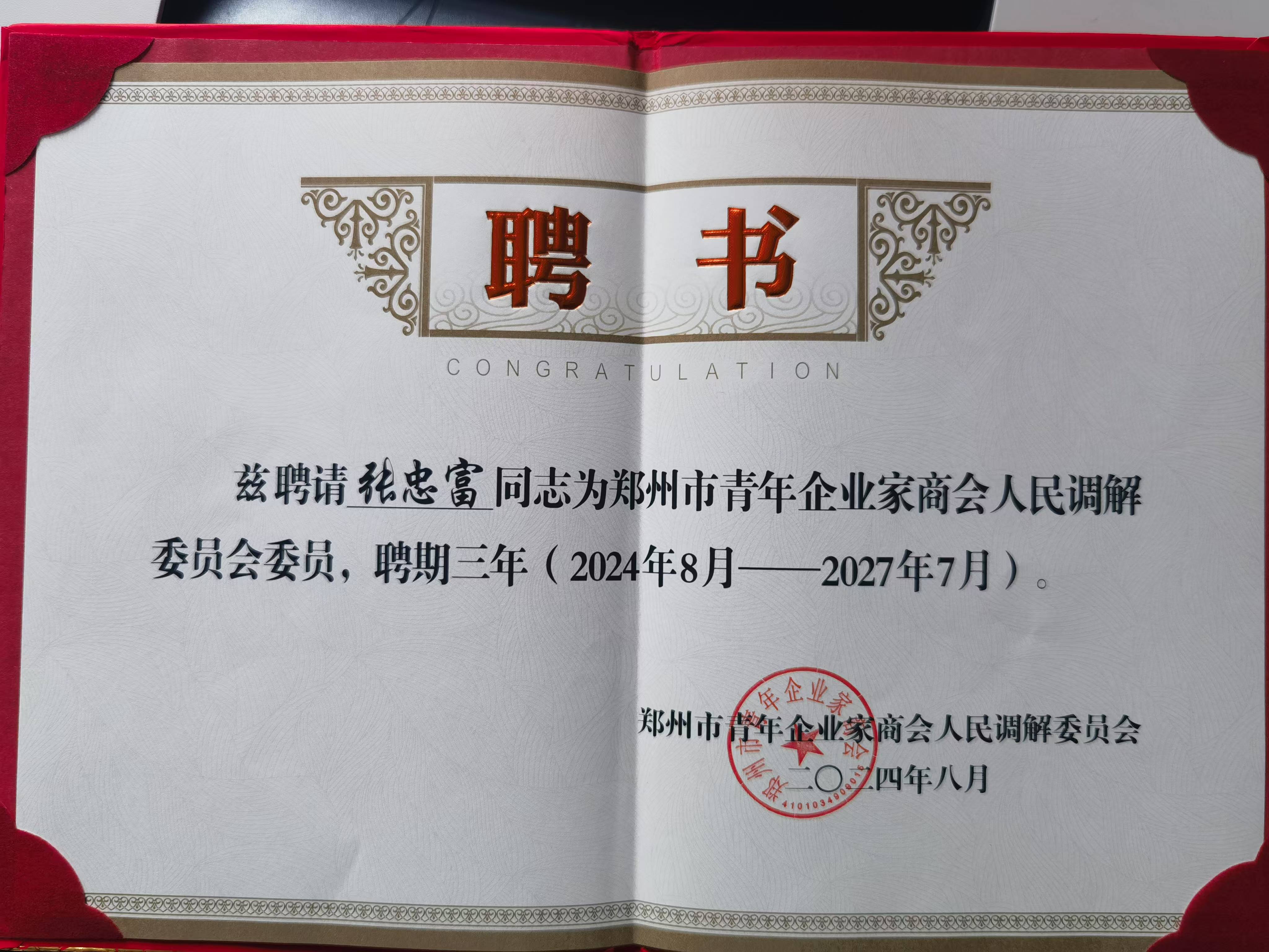 中锦律师事务所张忠富律师被郑州市青商会聘为商会人民调解委员会委员2024-08-07